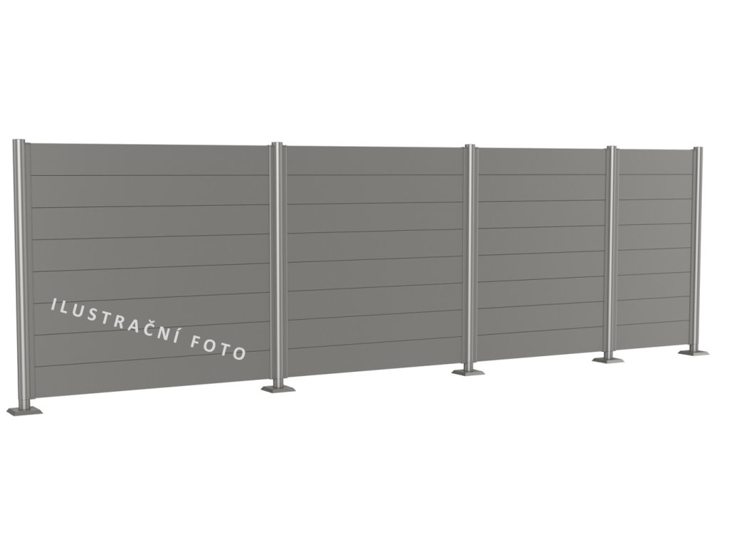 Technická specifikace:Rozměry: š x d x v (cm): 180 x 4,4 x 91Barva: tmavě šedá metalízaMateriál: žárově pozinkovaný ocelový plech opatřený polyamidovým vypalovacím lakemObsahuje 3 kovové panely a 1 panel z akrylového skla, dvě vodicí lišty pro montáž mezi dva sloupky zástěny pro ochranu soukromí, lze také připevnit na zeď domu a podobně