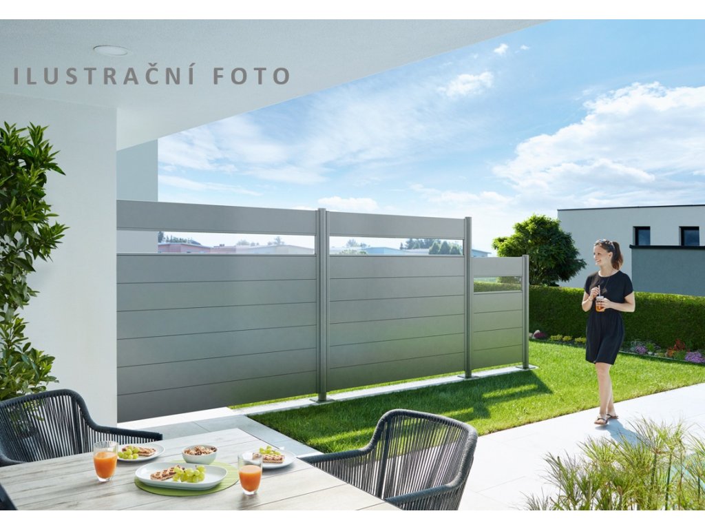 Technická specifikace:Rozměry: š x d x v (cm): 194 x 4,4 x 91Barva: tmavě šedá metalízaMateriál: žárově pozinkovaný ocelový plech opatřený polyamidovým vypalovacím lakemObsahuje 3 kovové panely a 1 panel z akrylového skla, dvě vodicí lišty pro montáž mezi dva sloupky zástěny pro ochranu soukromí, lze také připevnit na zeď domu a podobně