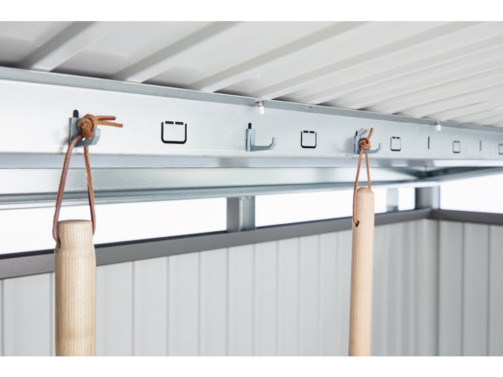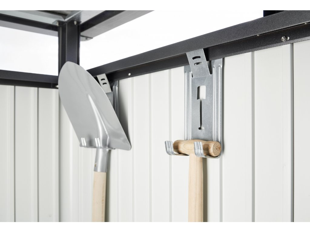 • 4 držáky zahradního náčiní (pro zavěšení lopat, hrábí, hadic apod.)
