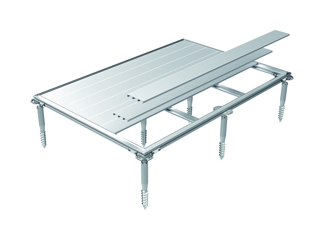 Základ tvoří: hliníkové podlahové desky s žebrovaným povrchem, speciálně navržený základový hliníkový rám a zemní vruty pro maximální stabilitu a bezpečnost.