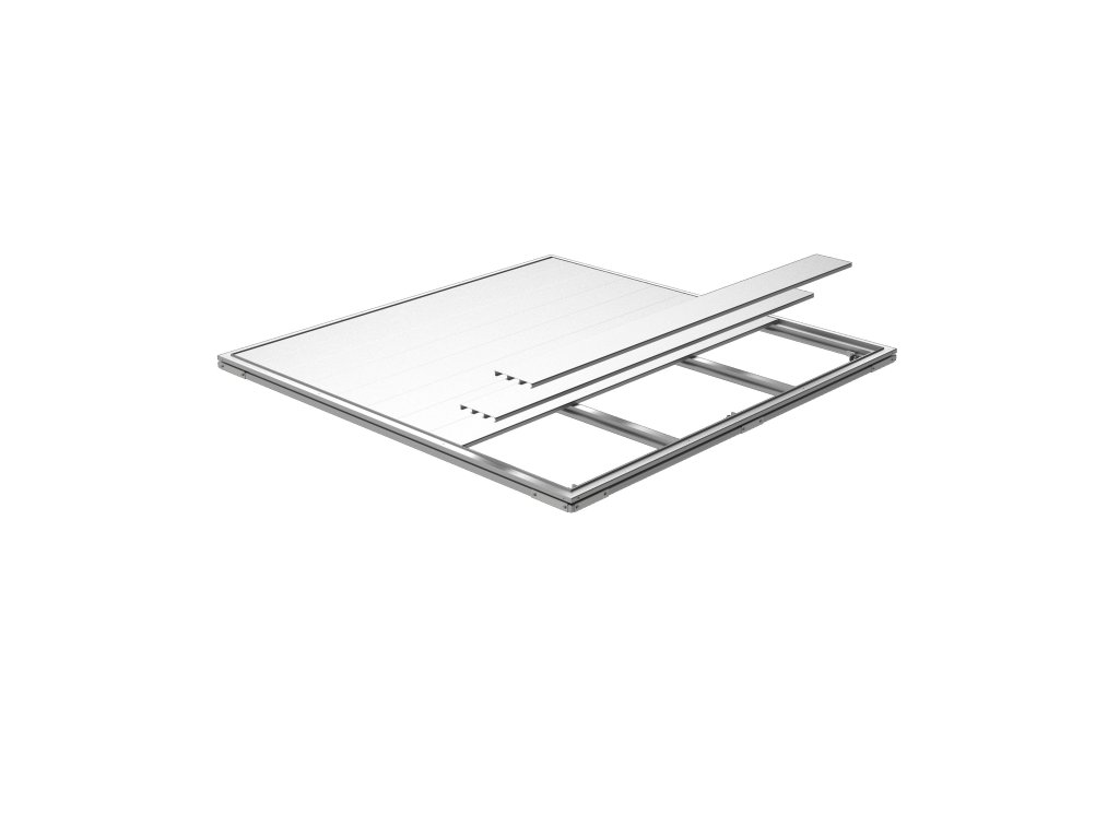 ZZáklad tvoří: hliníkové podlahové desky s žebrovaným povrchem, speciálně navržený základový hliníkový rám a výškově nastavitelné nožky.